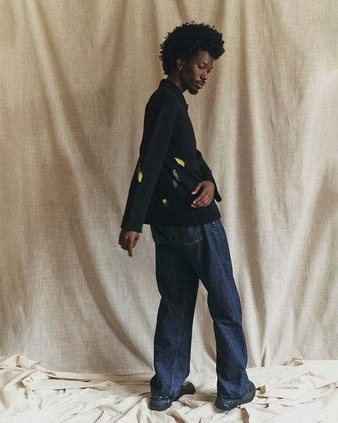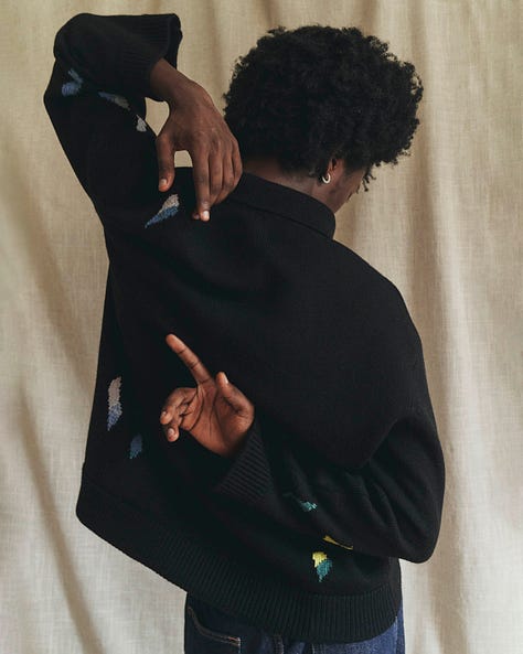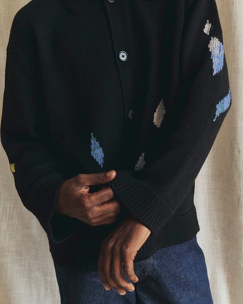 “The Current is a unisex knit cardigan that reimagines the timeless chore coat form — wrapping her wearer in soft splatters of color intarsia-knit into the blank-canvas-black of a classic chore coat silhouette. Weighty yet smooth, The Current doesn’t cling; with a balanced nature that feels steady and constant, she drapes and flows about the body instead. Like the ever-flowing current of a hometown river, her presence is comforting and familiar, yet distinctly one-of-a-kind — inviting you to revisit her again and again, and to rediscover something that feels new every time.” —lovely description by Shaina Yang