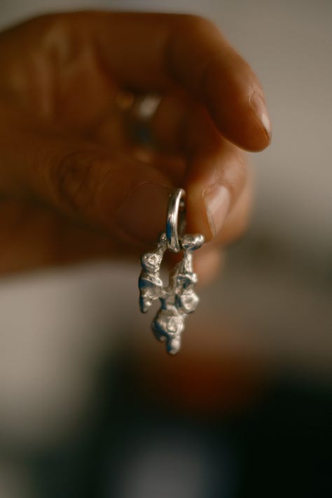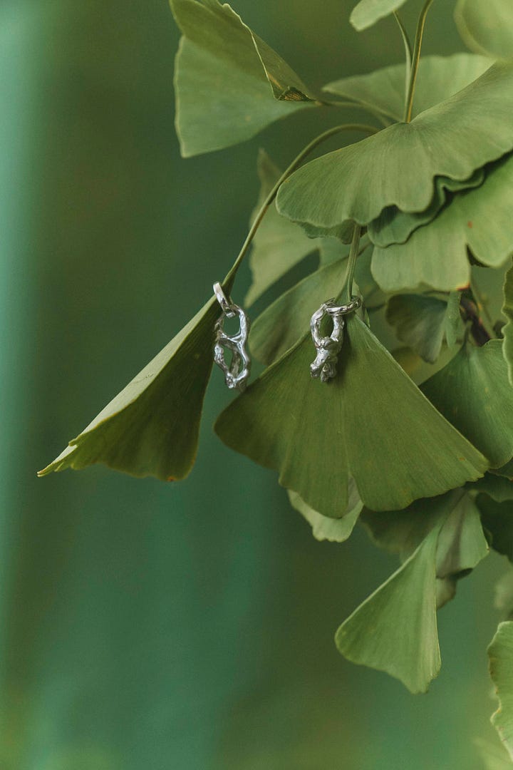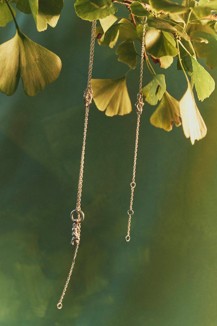 We imagined each of these objects as a character that lived in the world of “The Boy and The River,” to which Shaina gave names: “The Willow” for the necklace with its languid boughs; “The Butterfly” and “The Bee” for the two single earrings that felt energetically both together and distinct.