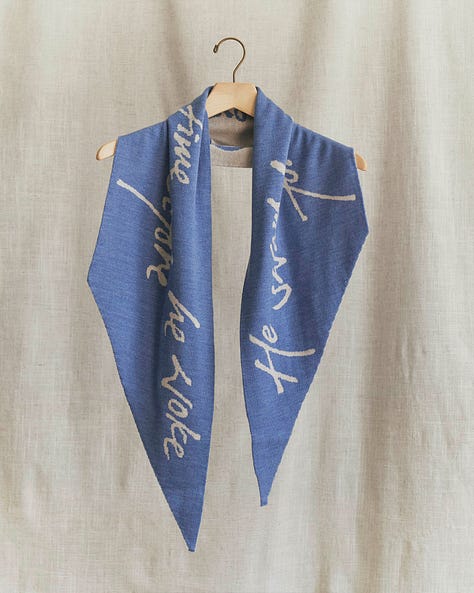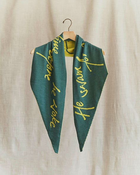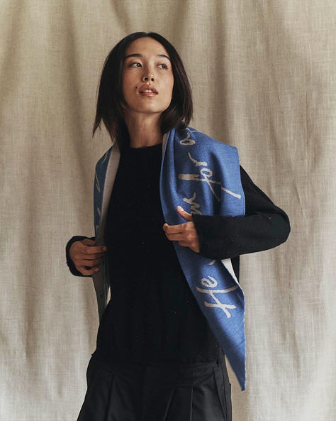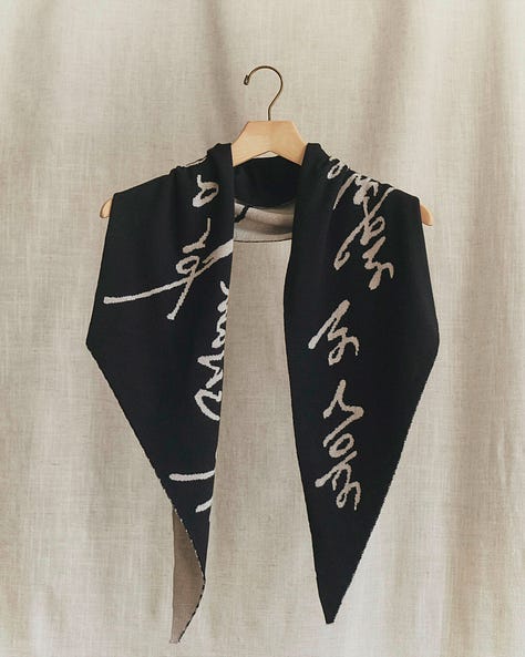 The scarf in the collection is an elongated trapezoid mimicking the paper boat’s shape, knitted in a two-toned reversible tubular jacquard (for my knitting nerds), bearing the last line of “The Boy and The River” in Shaina’s handwriting.