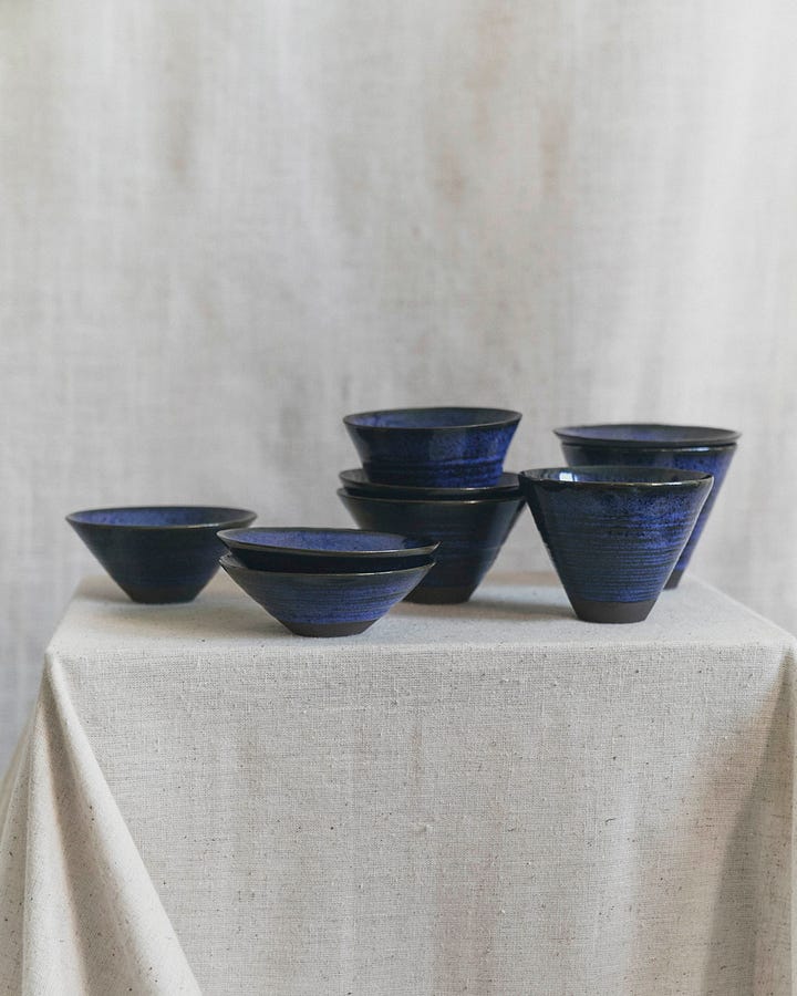 The blue cups are “The Rain,” specifically of the droplets hitting the surface of the water at night. Anna hand-trimmed the base of each cup to give it a kind of texture that can only be sensed through the drinker’s fingertips.