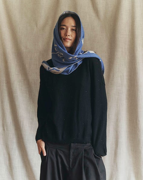 I’m a garment designer after all, so the scarf is designed to be flattering and functional. I tweaked the proportions so that it can be worn draped over the shoulder, tied around the neck, or wrapped over the head for whenever one’s ears get chilly.
